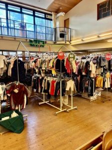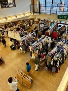 ホール中央にはフリーマーケットコーナーがあります。バザーの目玉は、赤ちゃん・子ども服から大人服まで幅広くたくさんの商品が並んでいます。早い者勝ちで、掘り出し物を狙って皆さん真剣に探していました。